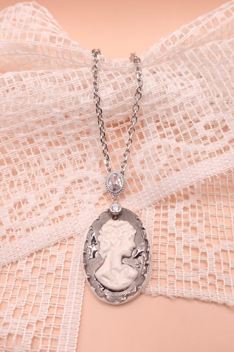Reproduction du camée en porcelaine de ma grand-mère Angèle, ce collier allie souvenir et élégance. Son pendentif en platine met en valeur un profil féminin intemporel, symbole de transmission et de raffinement.