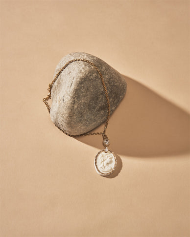 Reproduction du camée en porcelaine de ma grand-mère Angèle, ce collier allie souvenir et élégance. Son pendentif doré à l’or fin met en valeur un profil féminin intemporel, symbole de transmission et de raffinement.