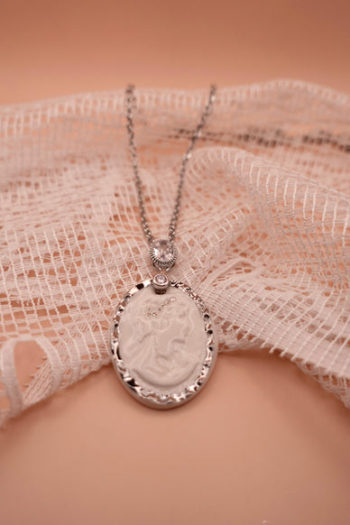 Reproduction du camée en porcelaine de ma grand-mère Angèle, ce collier allie souvenir et élégance. Son pendentif en platine met en valeur un profil féminin intemporel, symbole de transmission et de raffinement.