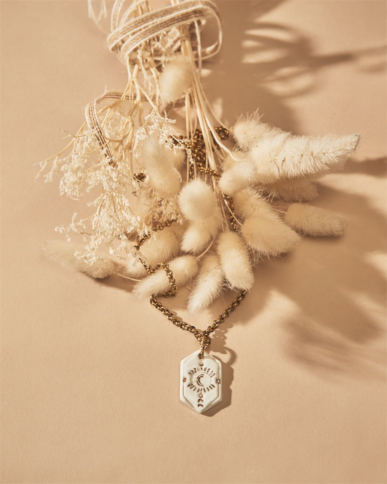 Collier doré orné d’un pendentif hexagonal en céramique blanche, gravé d’un motif solaire et lunaire doré. Un bijou symbolique et lumineux, à la fois délicat et intemporel.
